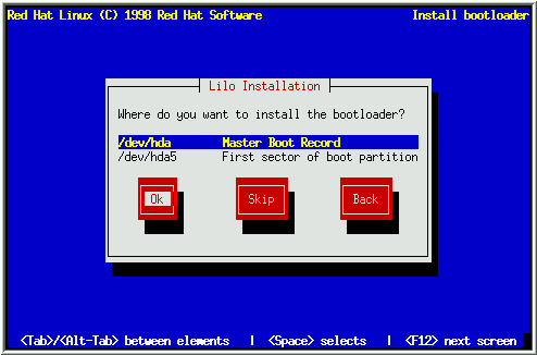 Please Note: If you choose Skip, you will not be able to boot your Red Hat Linux system directly, and will need to use another boot method (such as a boot diskette). Use this option only if you know you have another way of booting your Red Hat Linux system!