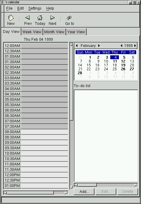 The Day tab is probably the most useful view in the GNOME Calendar as it acts just as a day timer would. On the left of the tab is the hour listing for the current day. The light grey coloring in the hour list separates the work hours from the non-work hours. If you would like to change the work hours displayed in light grey you can do so in the section called Setting Up the GNOME Calendar.